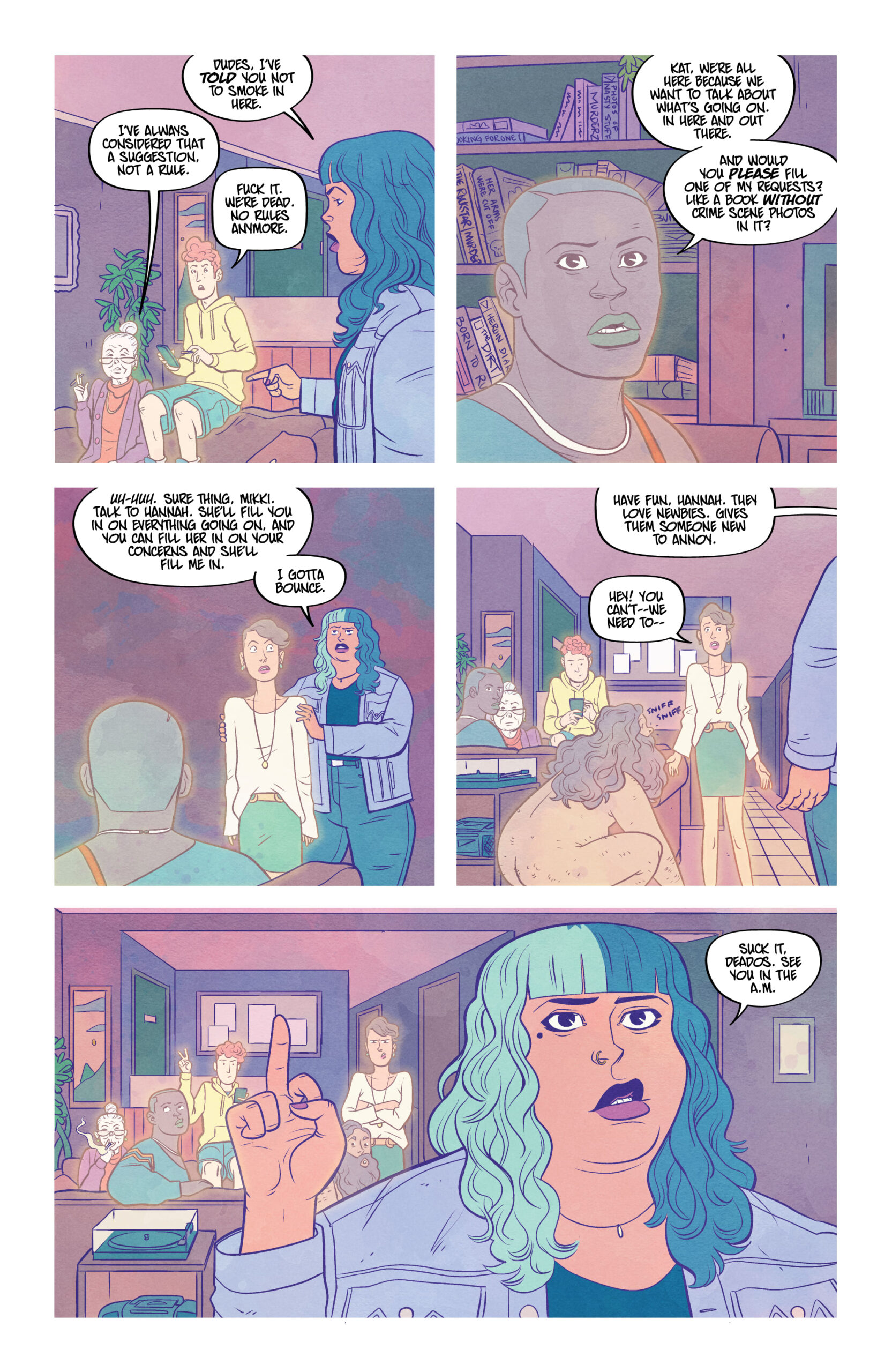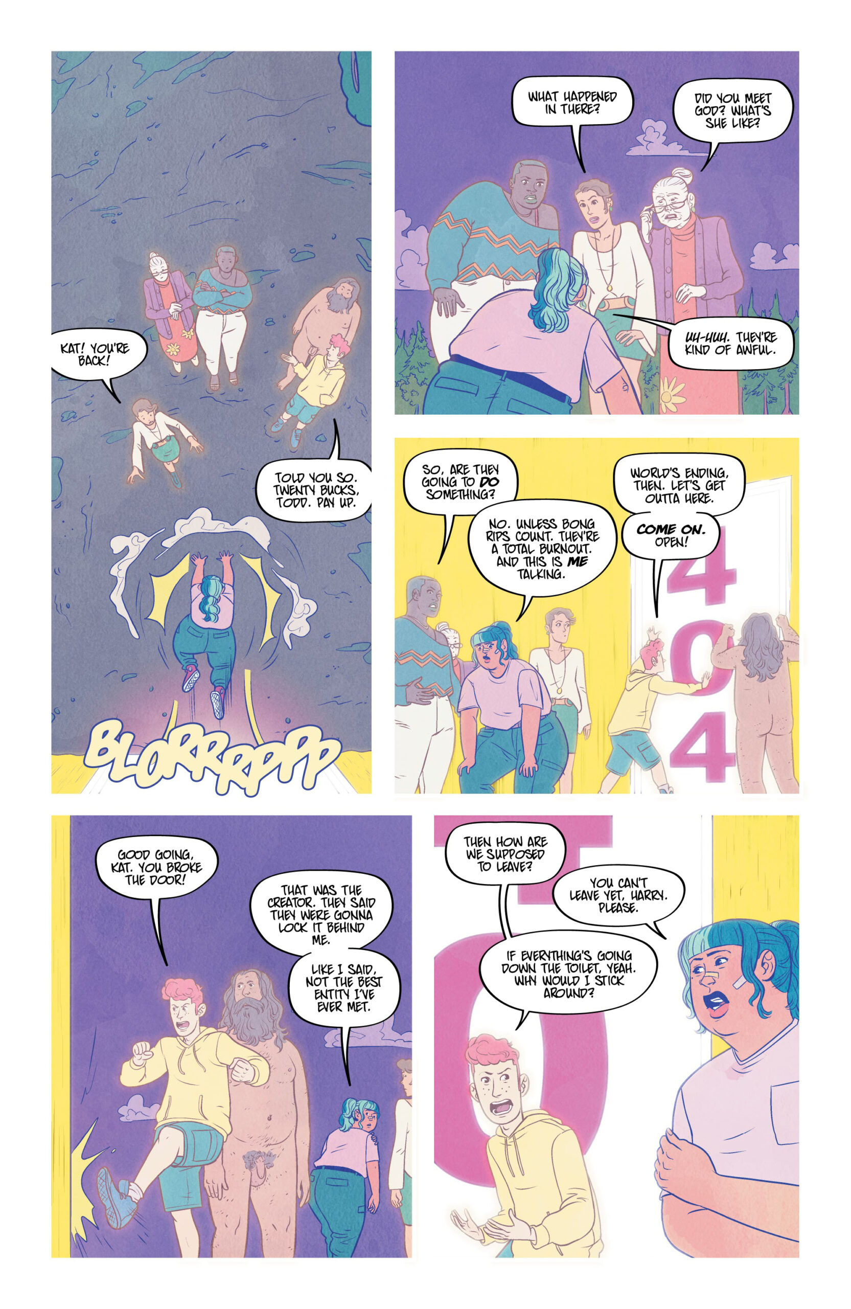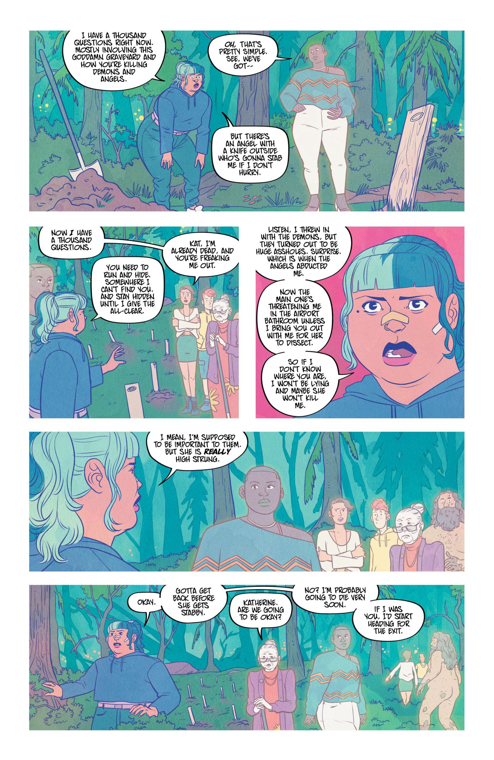 Sheโs stoned. Sheโs selfish. Sheโs all that stands between us and the end of the world. Where do you go when you die? Kat, a stoner with a flexible moral code, can answer that, and the answer is: not very far. Unfortunately for Katโs peace of mind, a near-death experience has left her with the ability to see and hear ghosts, as well as take them into her โmindscapeโ so she can bring them to locations of their choosing, essentially playing transporter to the deceased. But when Kat discovers sheโs the key to a demonic plan to screw up the whole world, she is forced to take an active role in the battle between good and evil. And sheโs not thrilled about it. Christopher Sebela (Injustice: Ground Zero, Crowded), Kendall Goode (The Doorman), and Gab Contreras (Witchblood) team up for a supernatural, stoner action-comedy that puts the โbooโ in booze cruise.